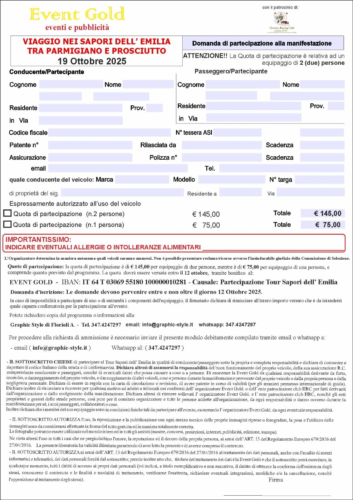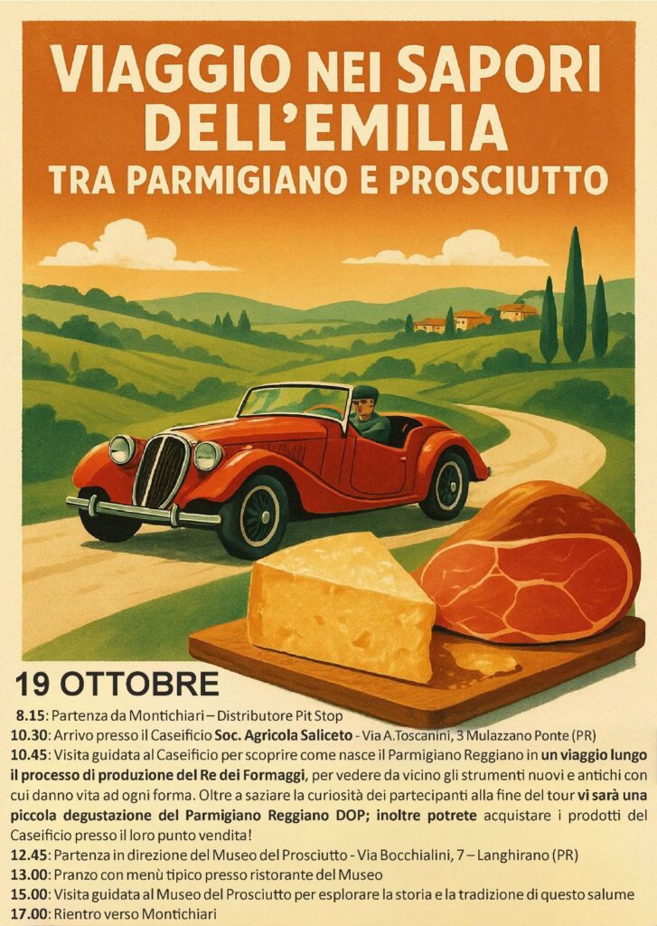 Una giornata dedicata ai motori e alle eccellenze gastronomiche dell’Emilia-Romagna. Il raduno riunirà appassionati di auto d’epoca per un itinerario tra le colline emiliane, alla scoperta dei sapori che rendono unica questa terra.